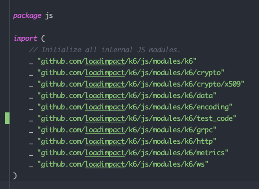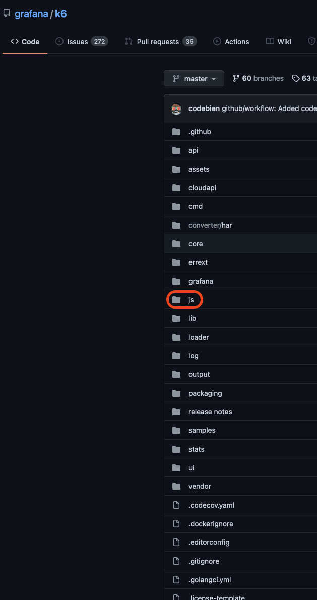 K6의 소스코드를 보게 되면, Js 폴더가 보입니다. 해당 소스코들이 Javascript를 의미하는 것이 아니라, 개발자 혹은 테스터들이 사용할 Javascript에서 사용가능한 Library를 의미하게 됩니다.