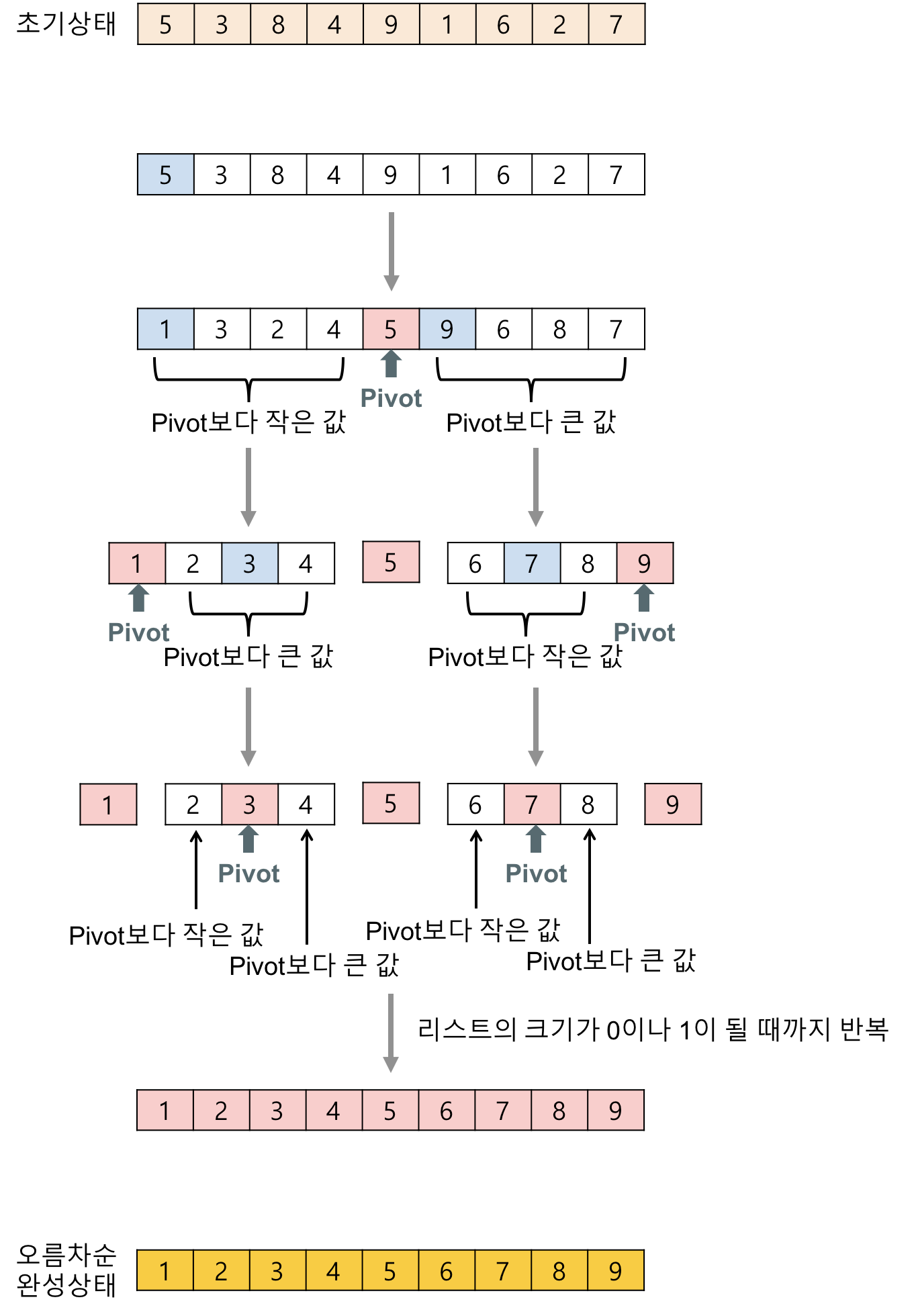 Quick 정렬은 Pivot (기준값)을 정하고, 자기보다 작은 값은 왼쪽, 큰 값은 오른쪽으로 배치를 시킨다.