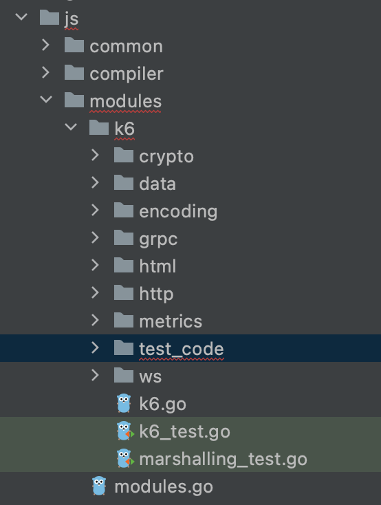 K6의 소스코드를 보게 되면, Js 폴더가 보입니다. 해당 소스코들이 Javascript를 의미하는 것이 아니라, 개발자 혹은 테스터들이 사용할 Javascript에서 사용가능한 Library를 의미하게 됩니다.